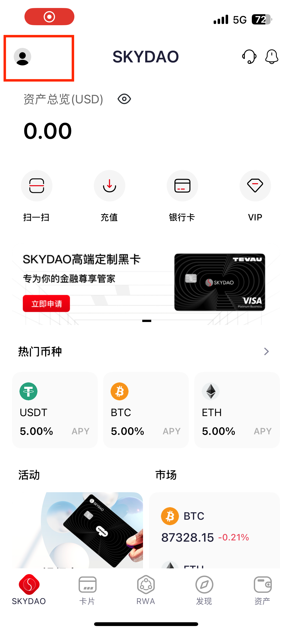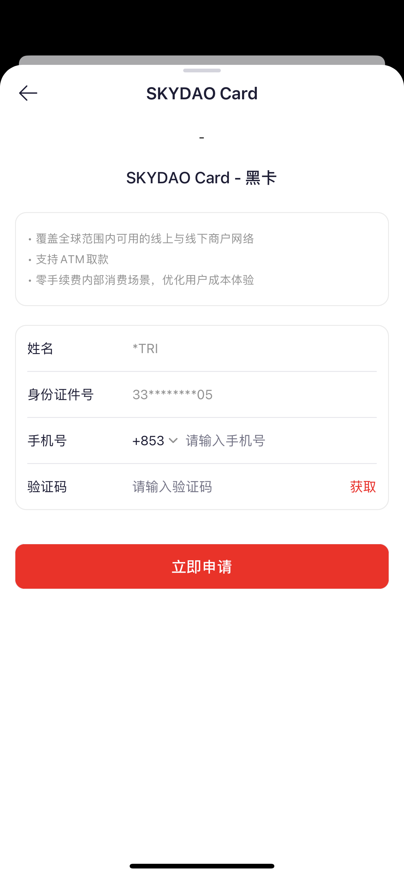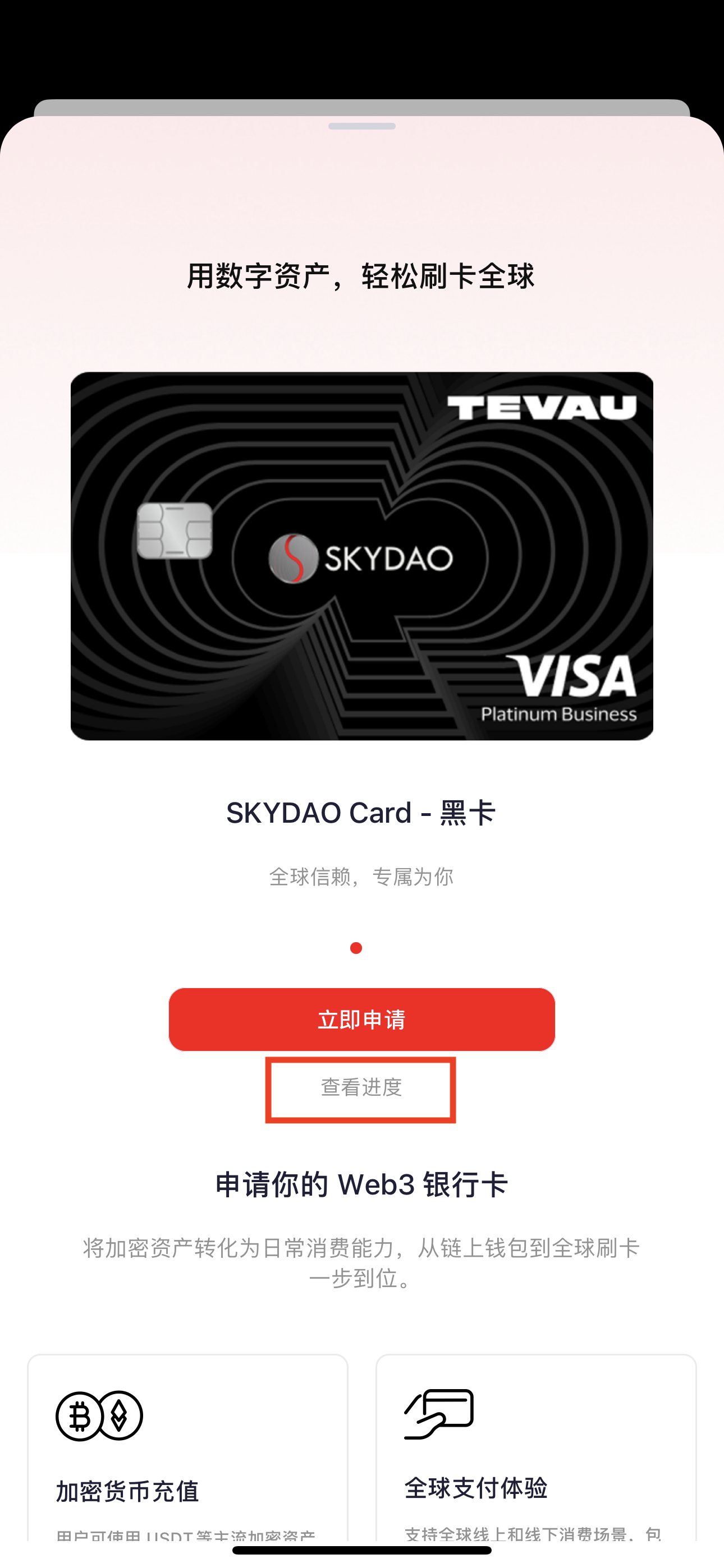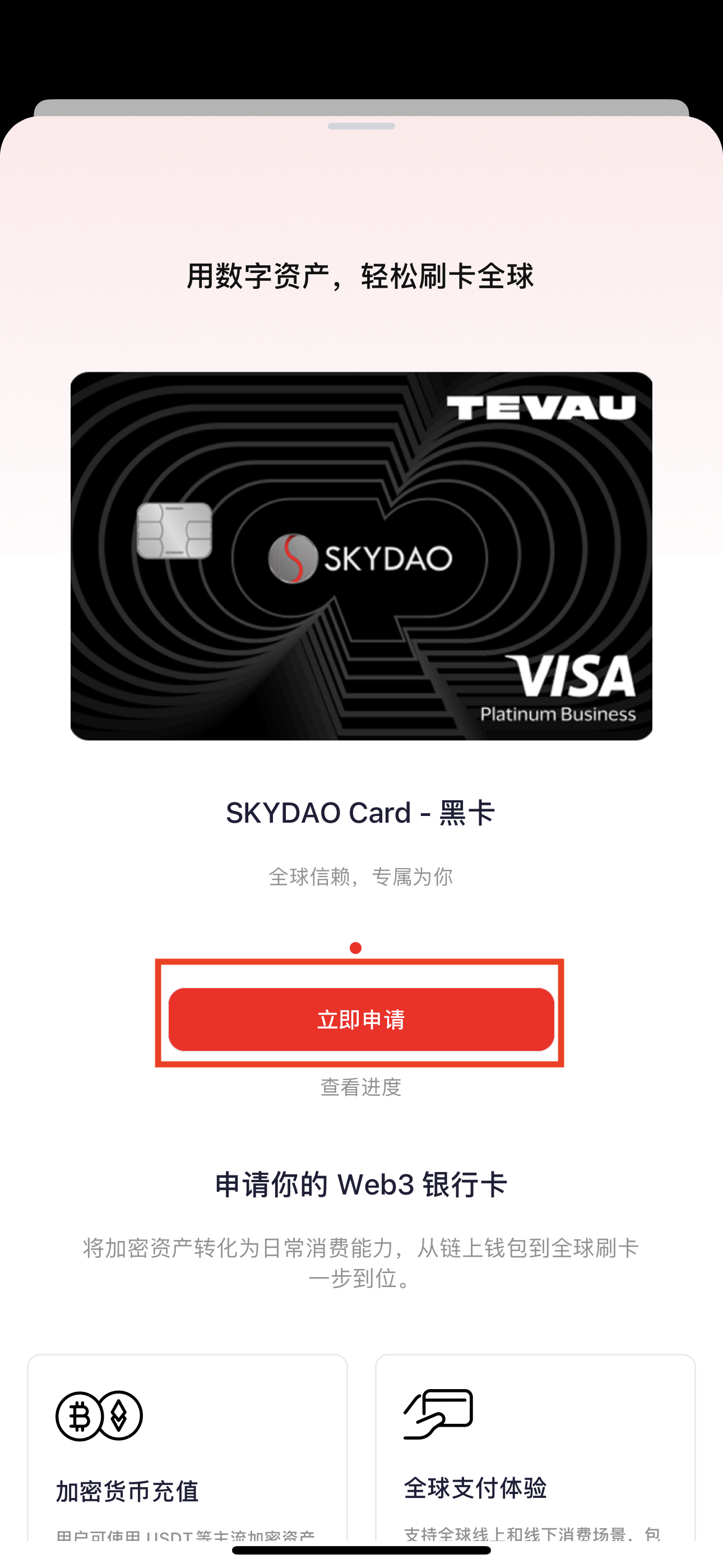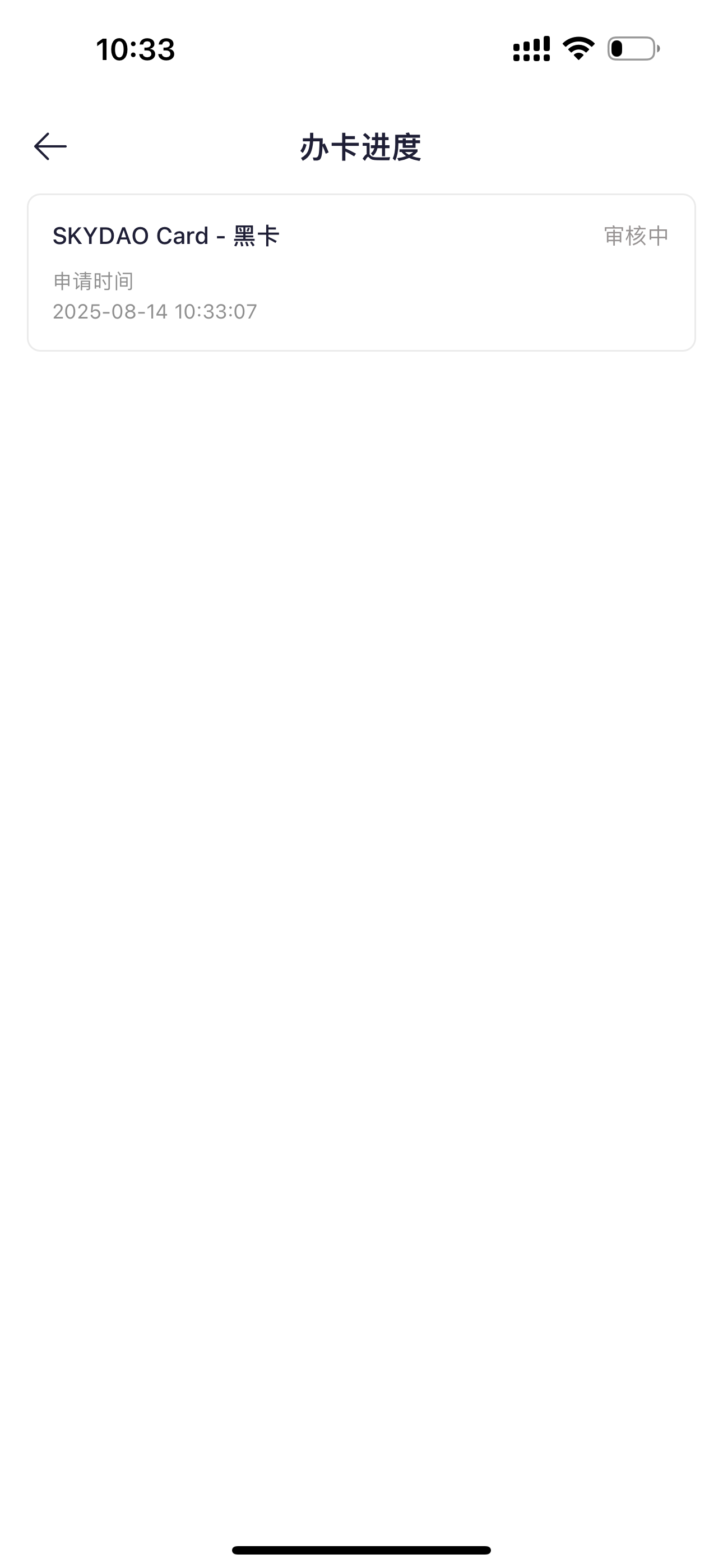 如果您还没有卡片,可以在SKYDAO APP 上支付100U申请一张属于您的加密货币卡片。在申请卡片时,如果您还没有完成实名认证,需要先完成实名认证。