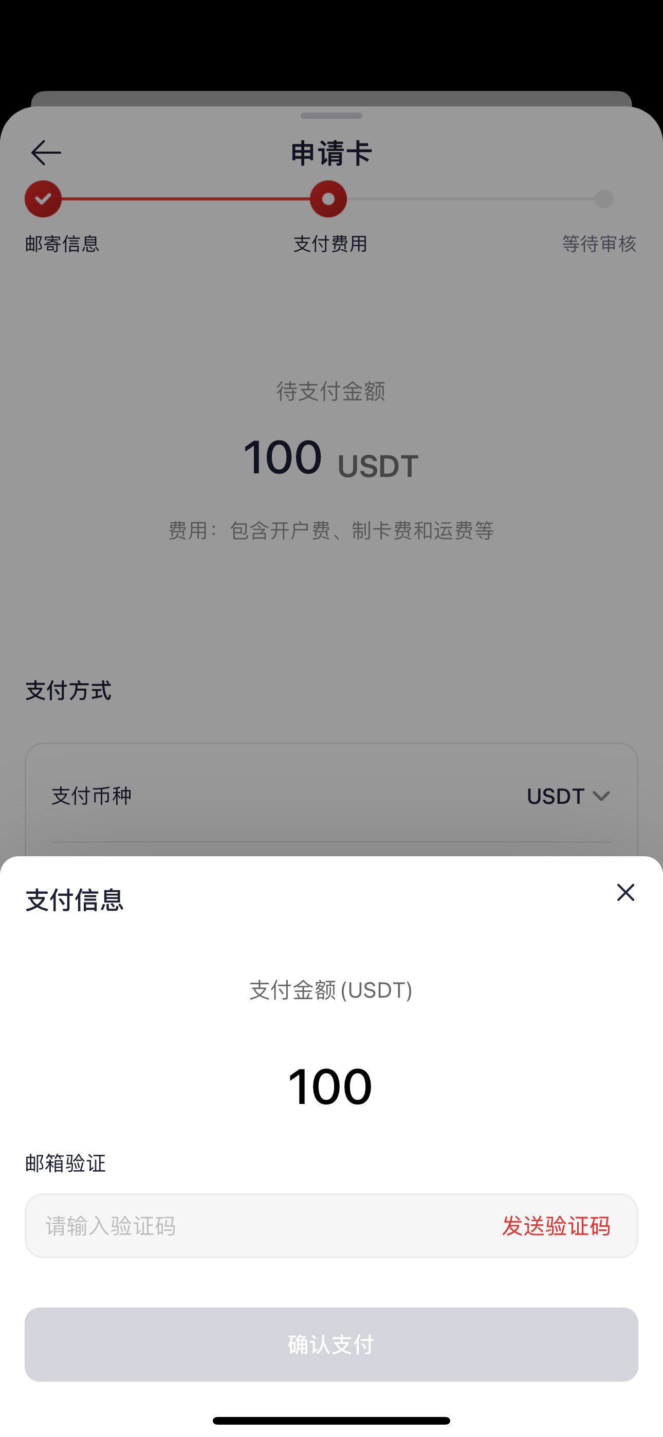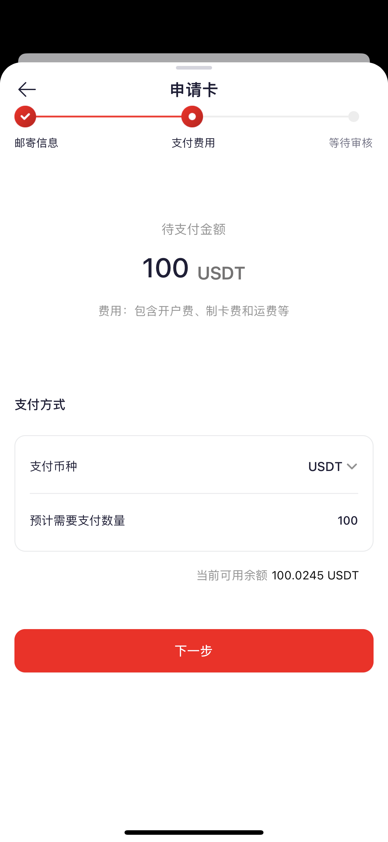 点击下一步,支付100 USDT的卡费,完成卡片申请,