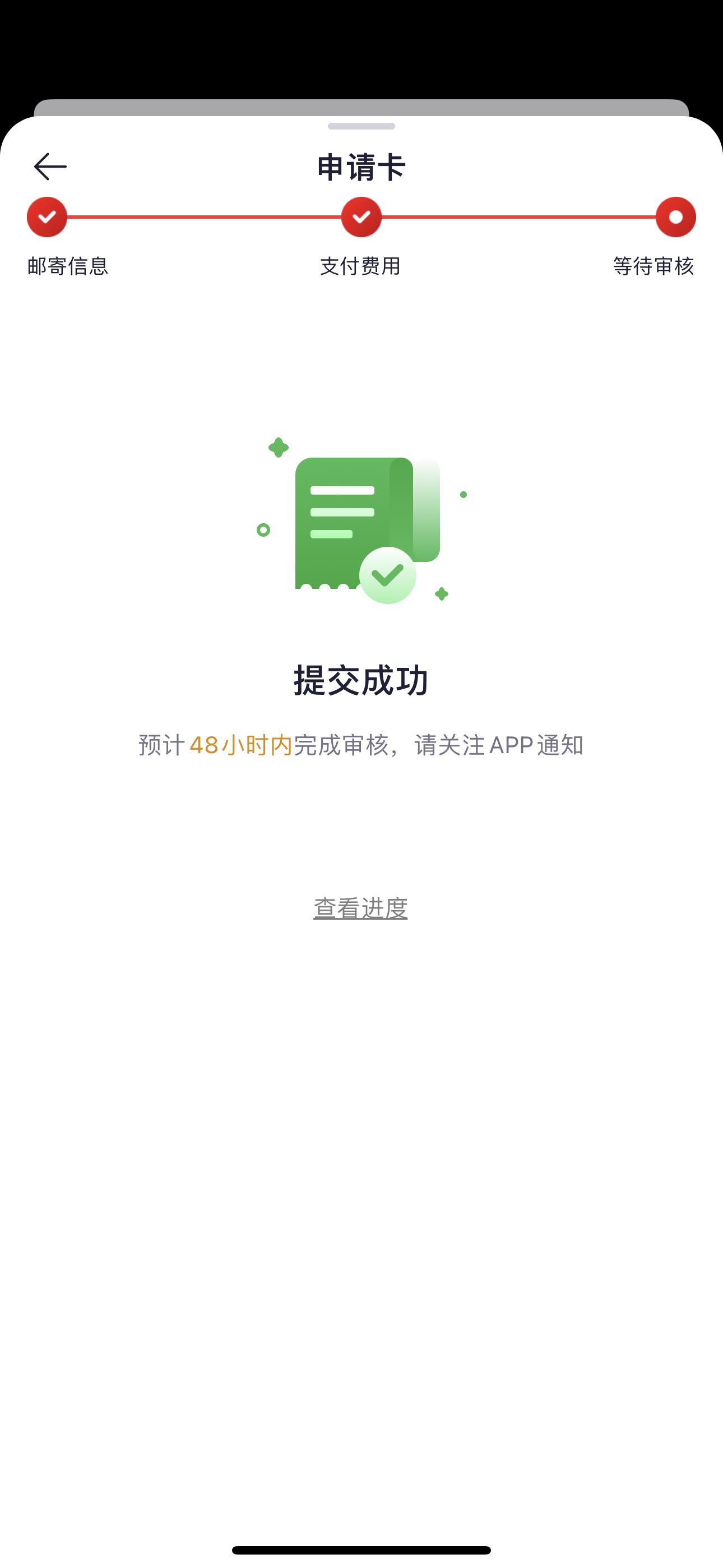 申请通过后等待邮寄即可,可以在申请页查看办卡进度。