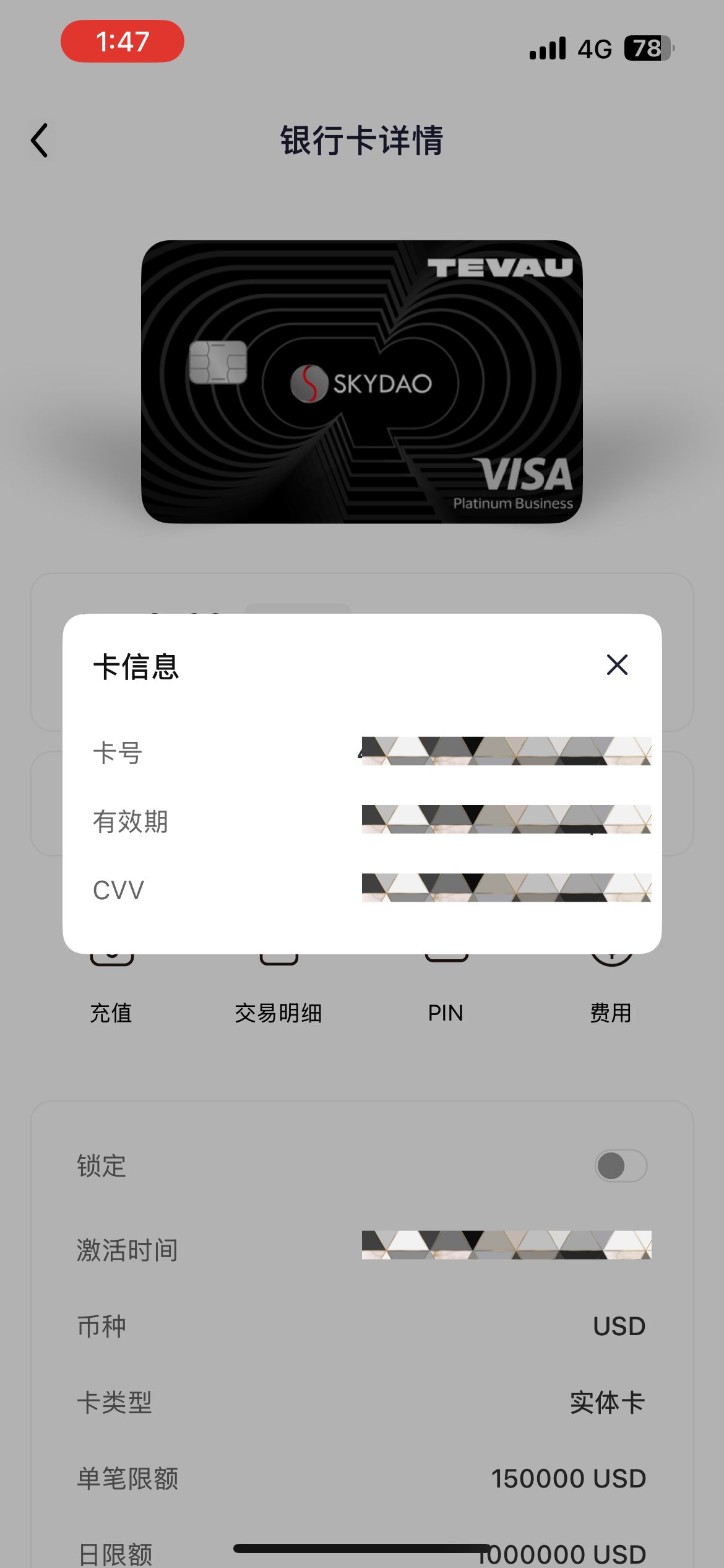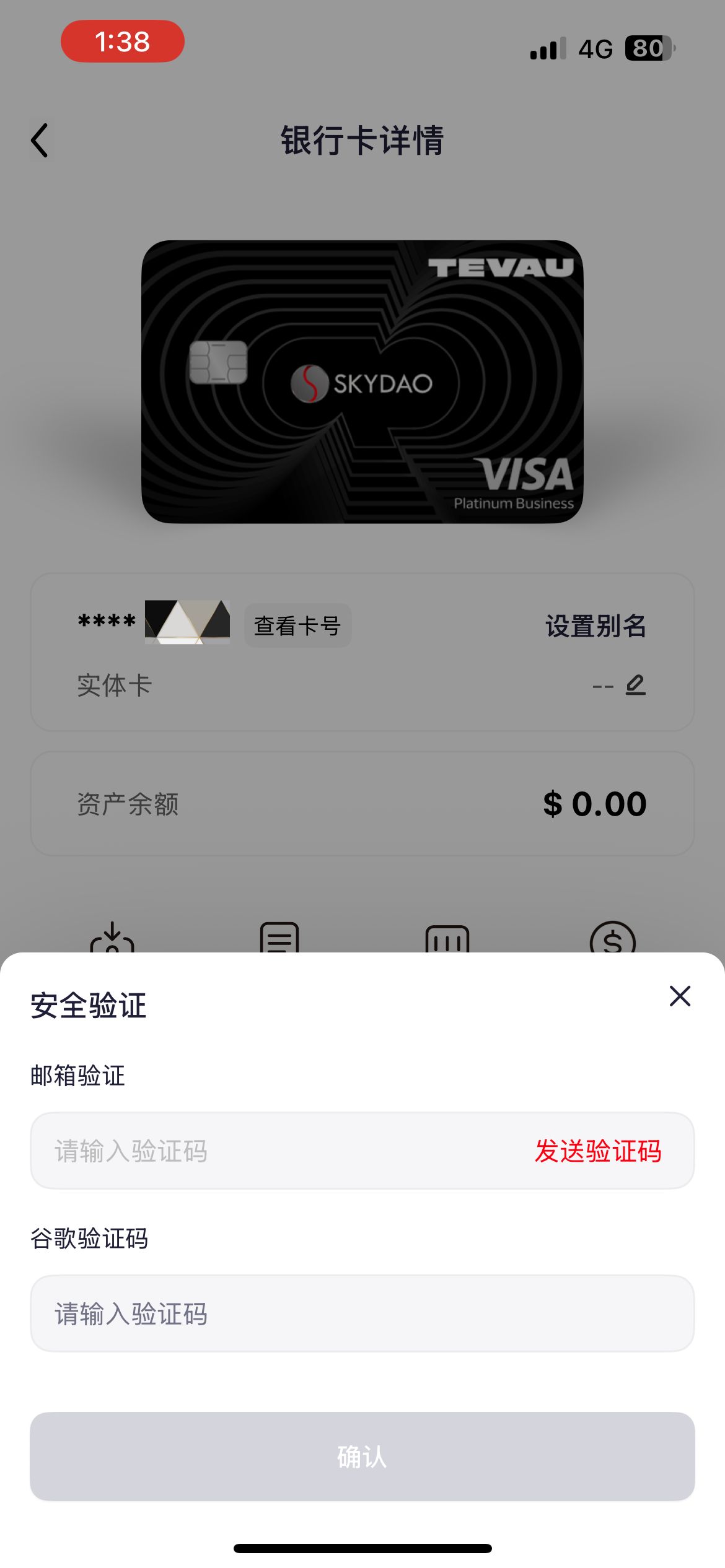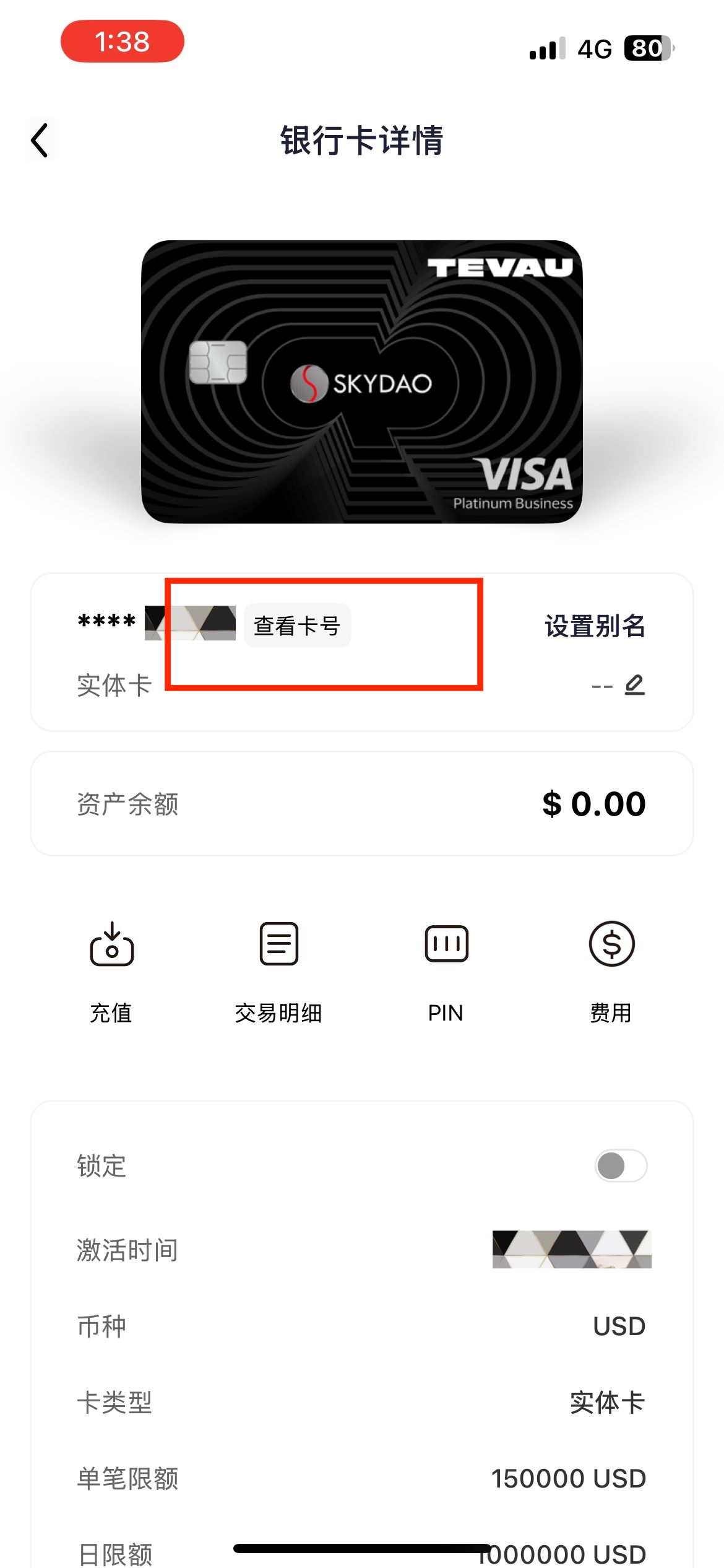 点击【卡片】-【查看卡号】,根据页面提示发送验证码,输入验证码,验证通过后即可查看完整卡号以及安全码和有效期。
