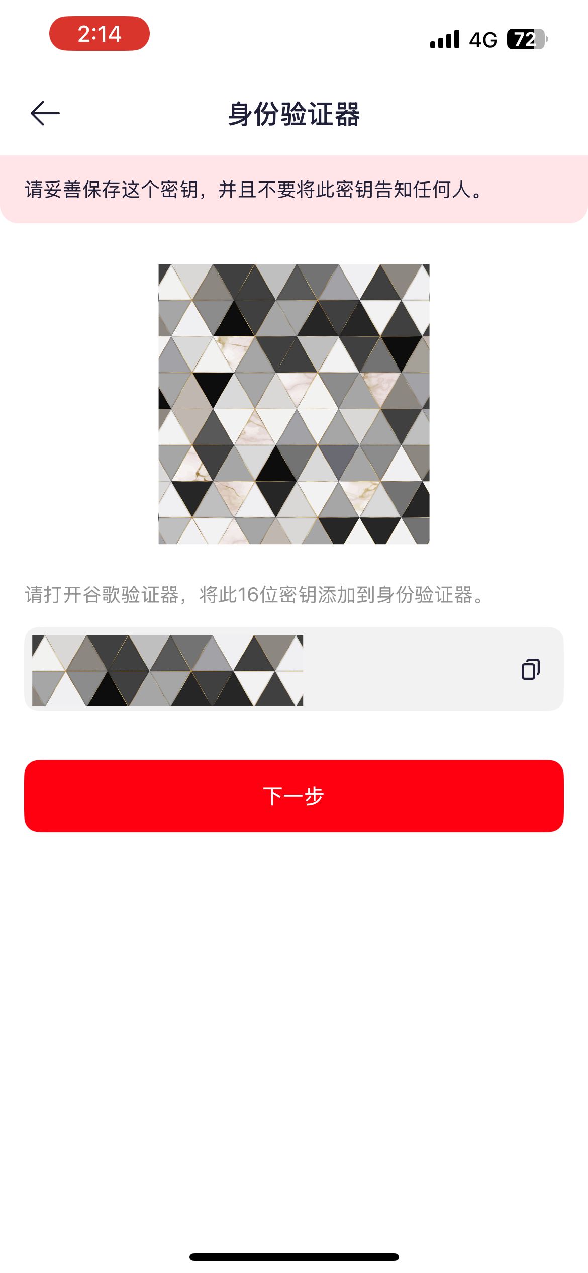 温馨提示: 请您务必保管好身份验证器密钥,以免更换或丢失手机导致无法登录,为了保障您的资金安全,重置谷歌验证码24小时内无法进行提币。